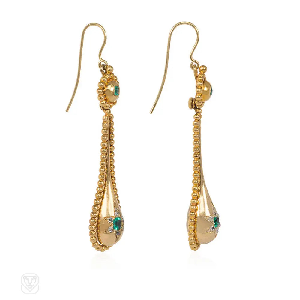 A pair of antique gold, diamond, and emerald drop-shaped pendant earrings, in 18k.
