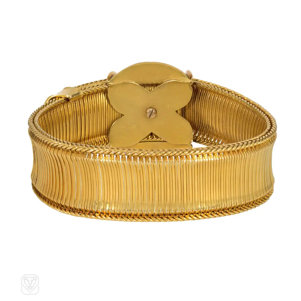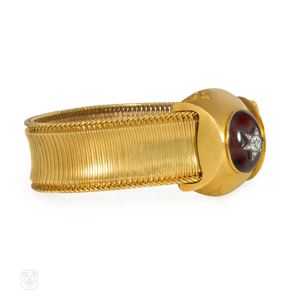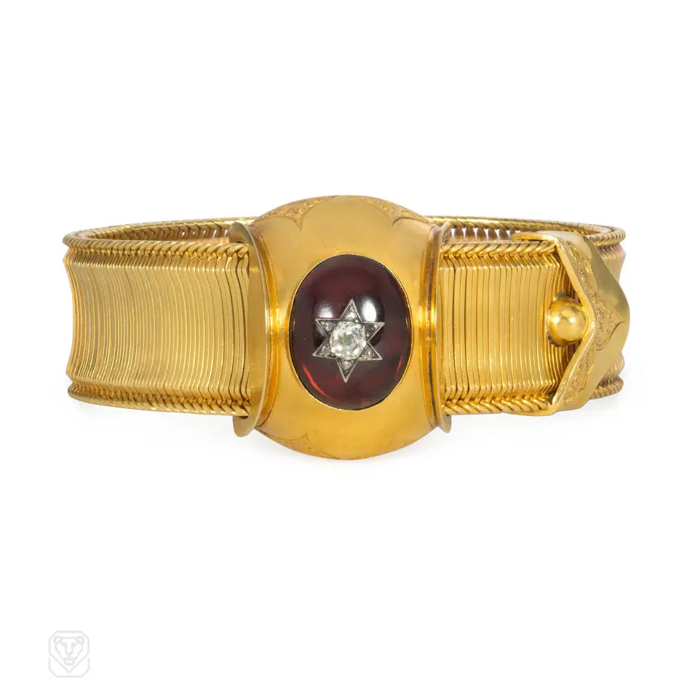 A Victorian gold jarretière bracelet comprised of an adjustable ribbed strap with a cabochon garnet bulla inlaid with a diamond star, in 15k. England. Center old mine diamond approximately 0.25 ct.