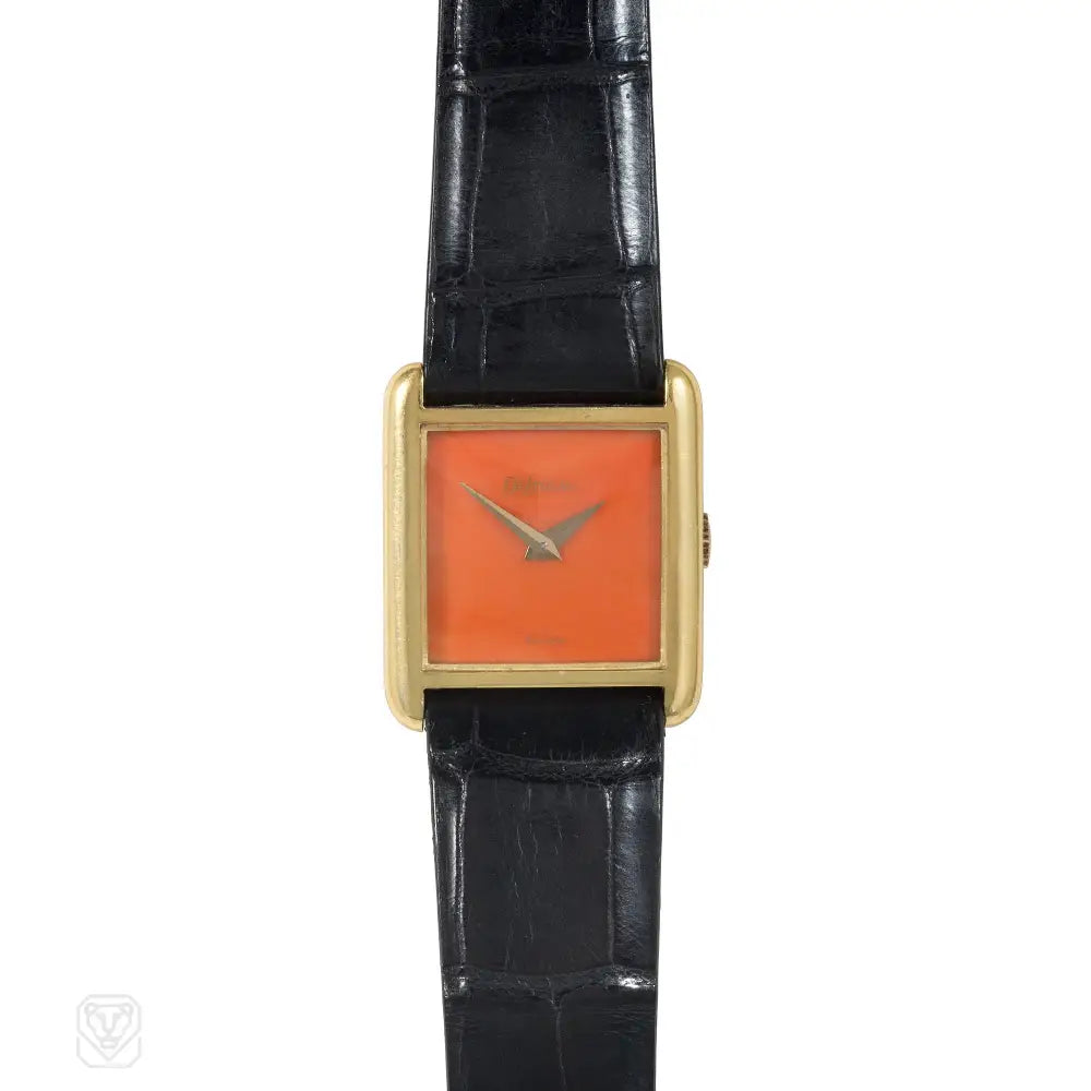 A gold tank watch with a coral face and blued steel dauphine heans, in 18k. DeLaneau, Switzerland.
