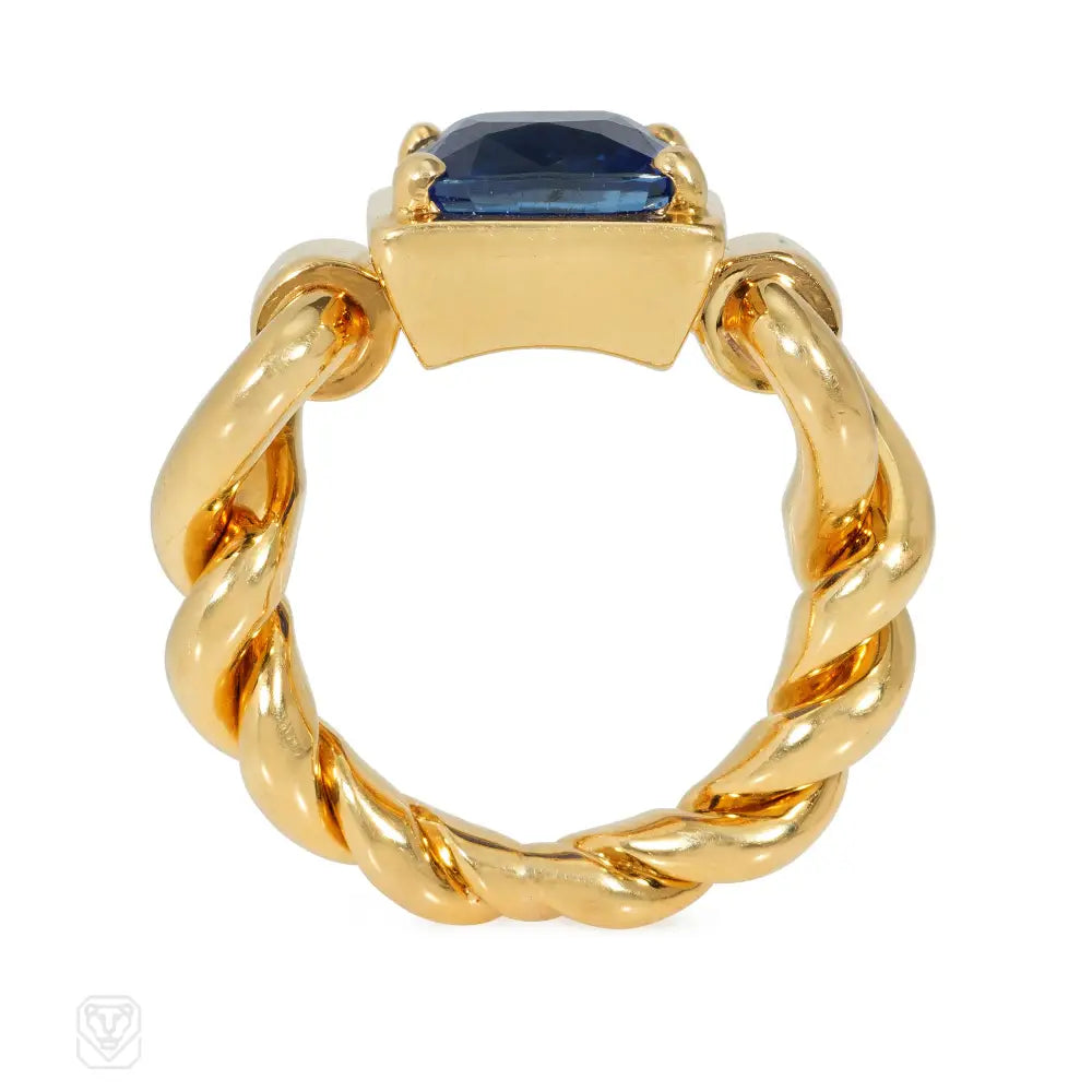 A Mid-Century gold and cushion-cut sapphire ring, centered by a prong-set, unheated, blue. Burma sapphire, atw. 6.87 cts. (AGL report #1151447), set within a square gold broder, with tapered shoulders and a twisted band, in 18k. Marchak, Paris.
