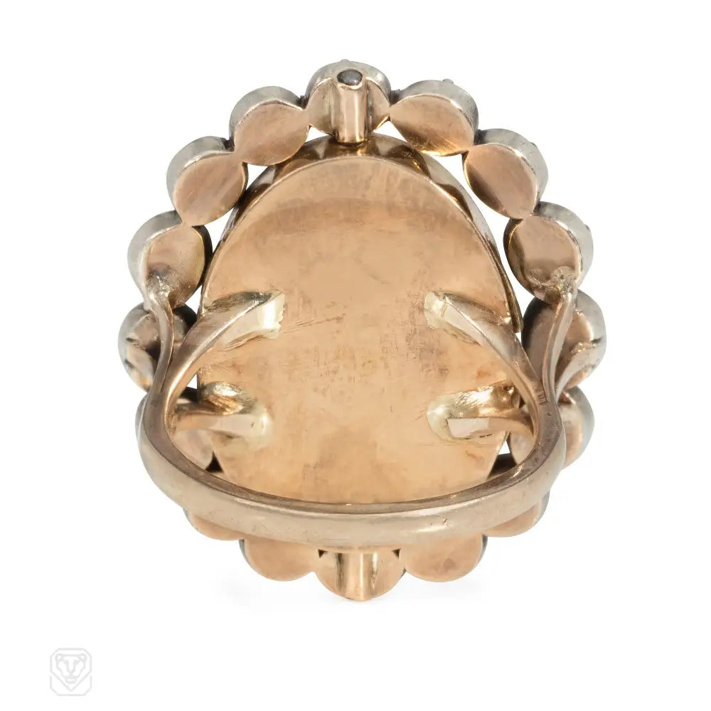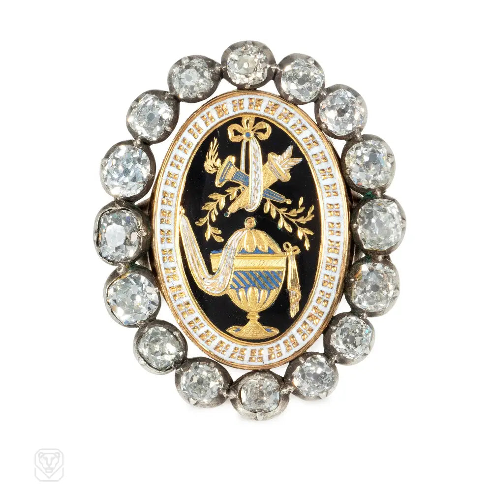 An Antique ring comprised of a black and white enamel Georgian mourning plaque depicting a shrouded urn, in a an old-mine diamond surround, in sterling silver and 14k. Clasp later remounted as a ring. Atw diamonds 3.00 cts.