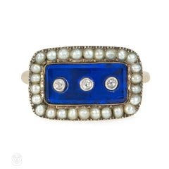 A Georgian plaque ring designed as a rectangular panel of blue enamel set with three diamonds in a seed pearl surround, in 14k gold