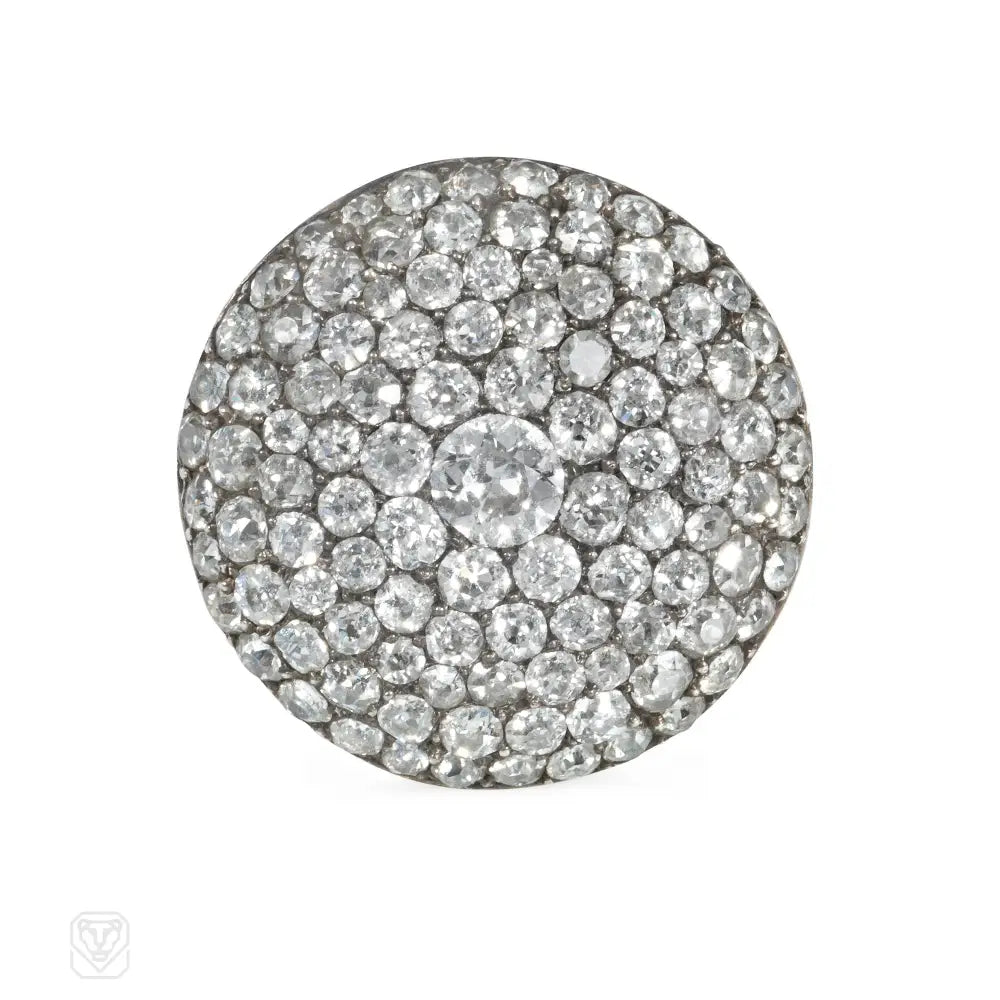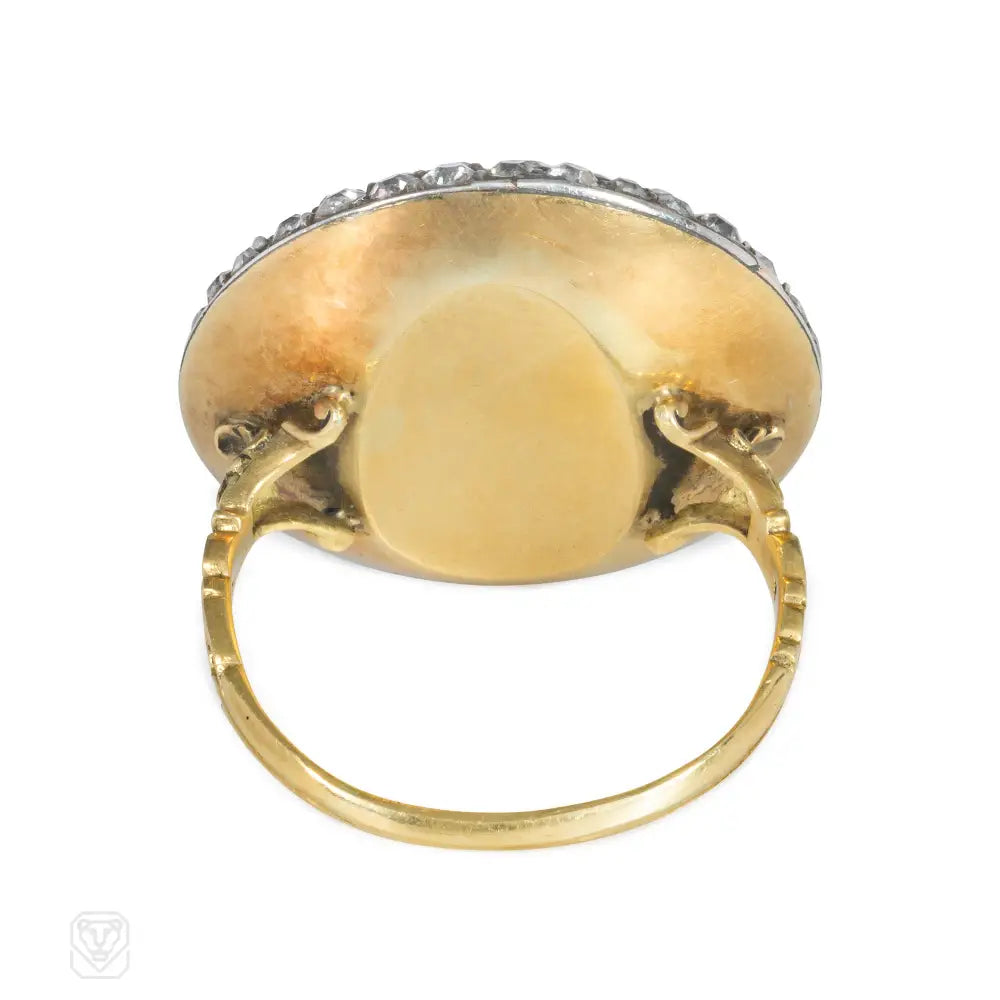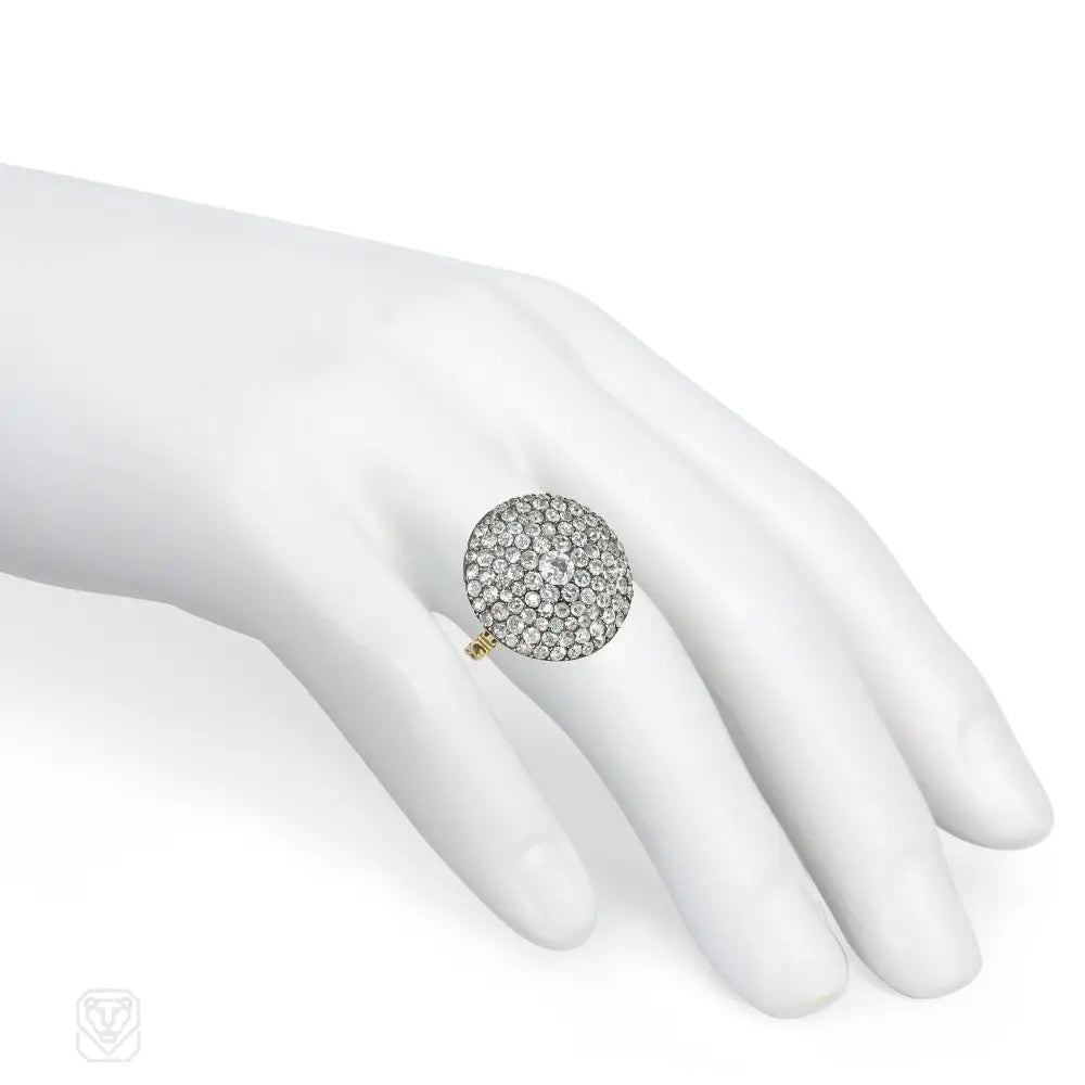 A Georgian pavé diamond ring of circular design with a carved foliate shank, in 18k gold. Atw diamonds 3.75 cts.