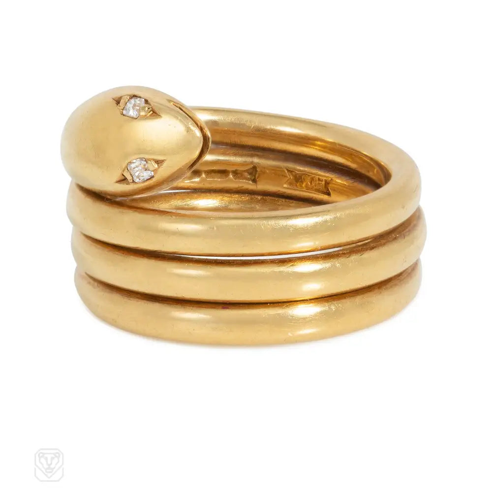 A Victorian gold ring designed as a coiled serpent with diamond eyes, in 18k. London, England.