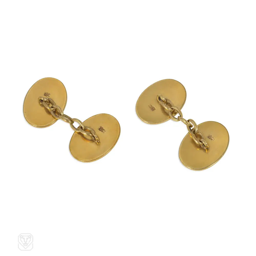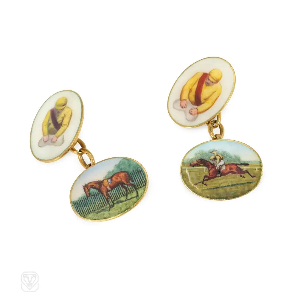 A pair of Victorian gold and enamel oval cufflinks depicting sporting scenes of racehorses and jockeys, with chainlink joiners, in 18k.