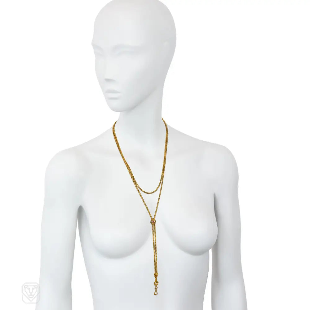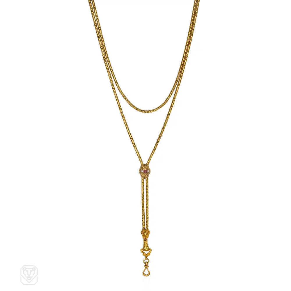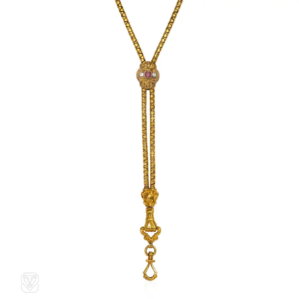 A Georgian gold longuard chain of cylindrical design, fitted with an engraved gem-set, barrel-shaped slide, and terminating in a swivelling dog-clip bale suspended from an engraved hand, in 18k. France.