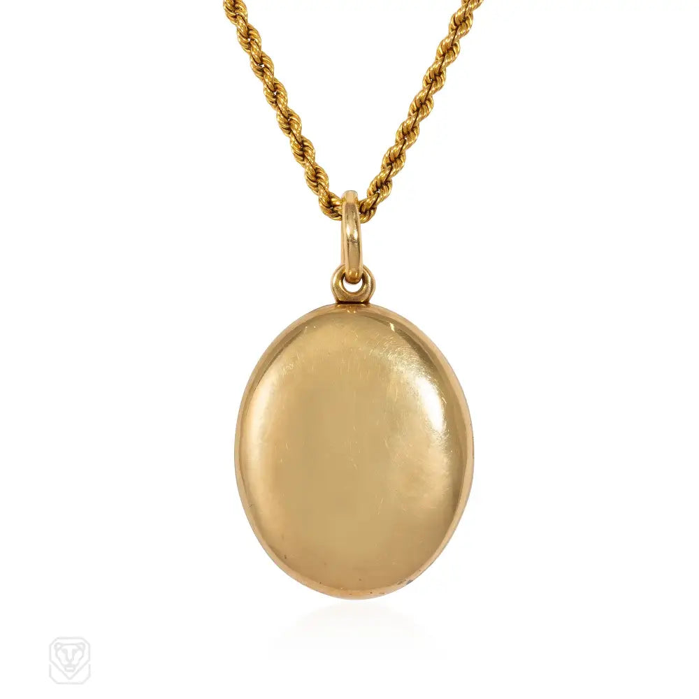 A Victorian gold, ropetwist, chain suspending an oval locket inset with garnets in a maltese cross motif, in 15k.