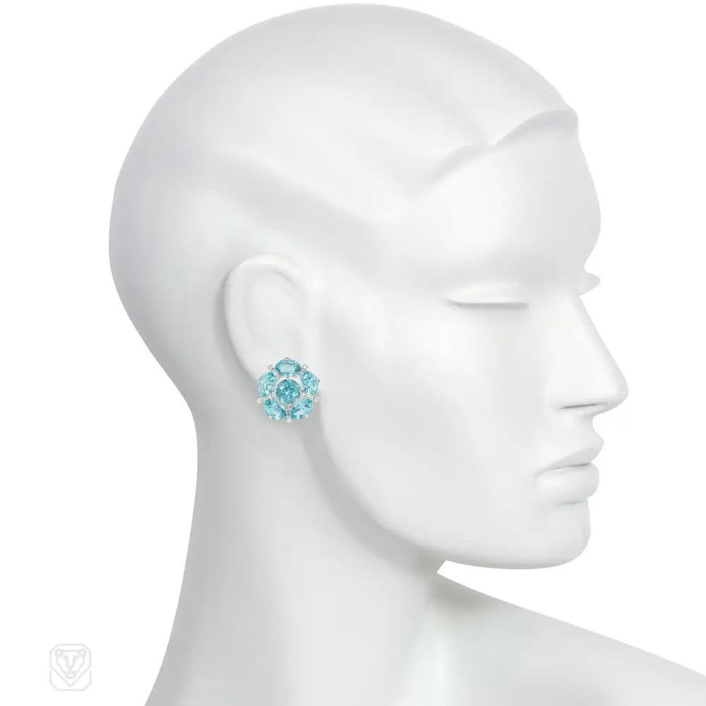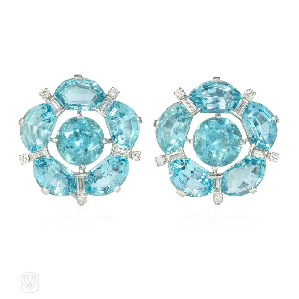 A pair of fancy-cut aquamarine earrings in the form of flowers with diamond spacers, in platinum. Atw diamonds 1.20 cts.