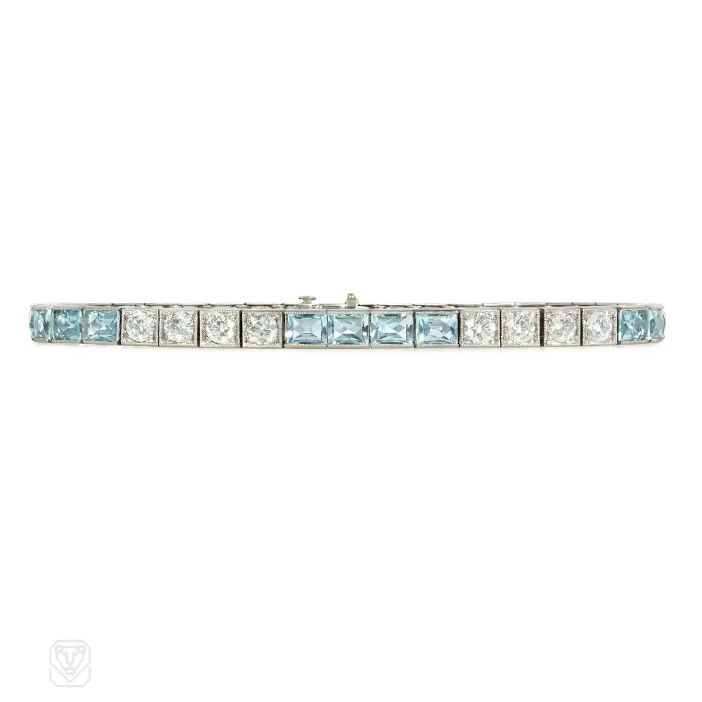 An Art Deco diamond line bracelet comprised of alternating sections of round diamonds and French-cut aquamarine, in platinum. Atw diamonds ~3.8cts, atw aquamarines atw 6.8cts.