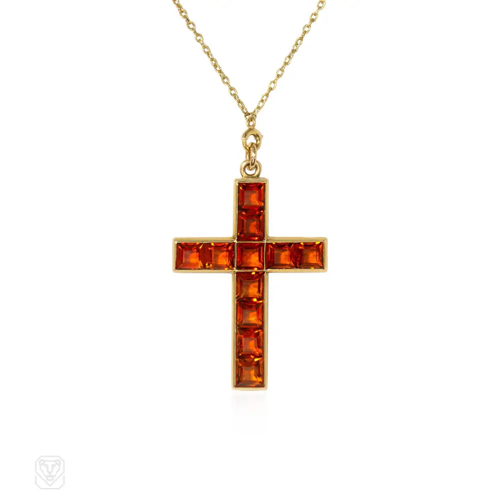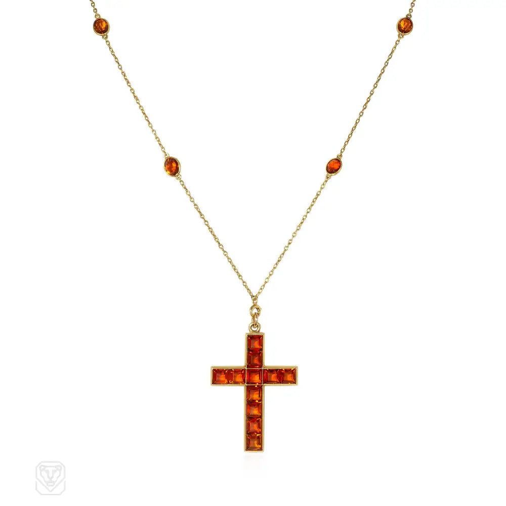 An Art Deco pendant necklace comprised of a citrine cross suspended from a gold muff chain set with citrines, in 14k.