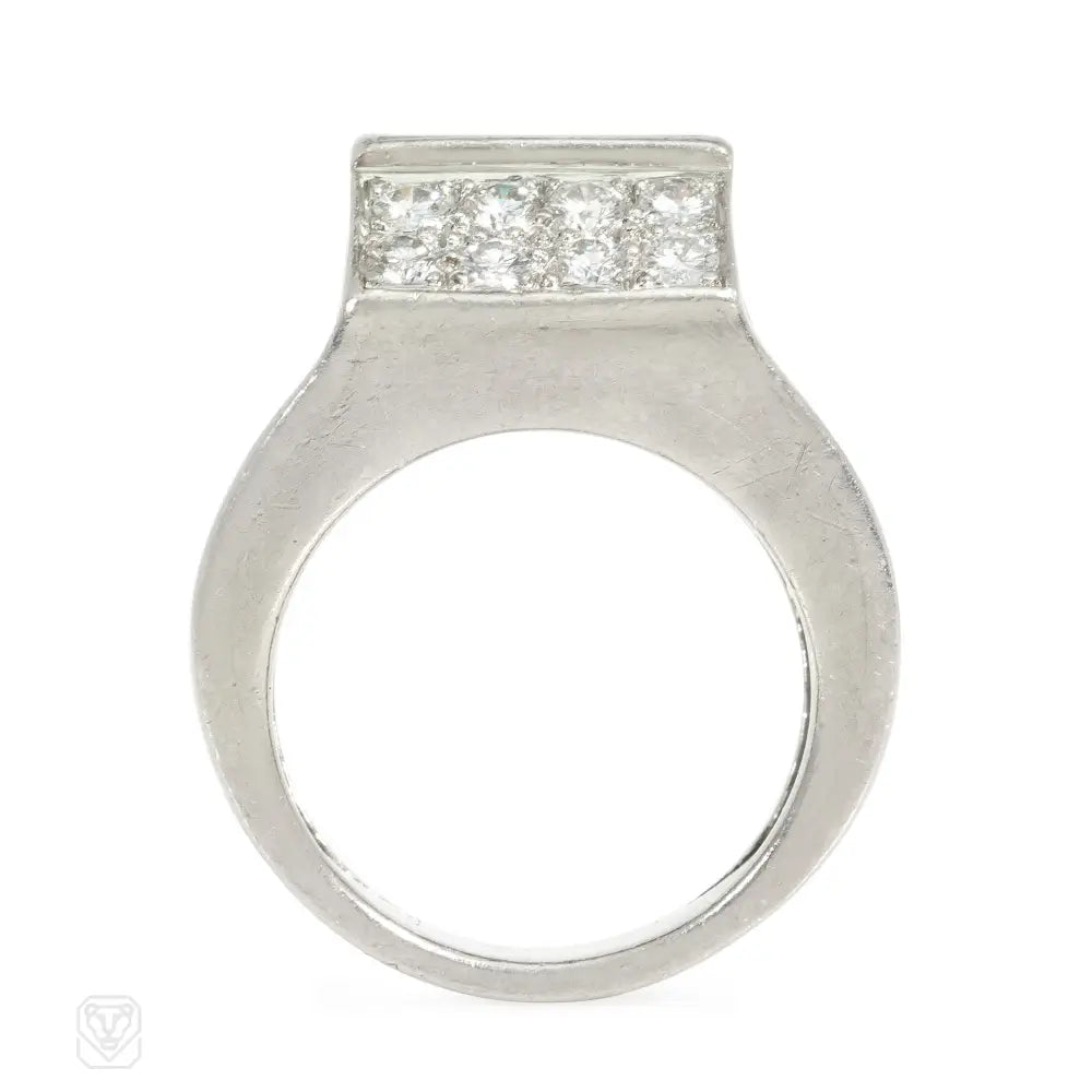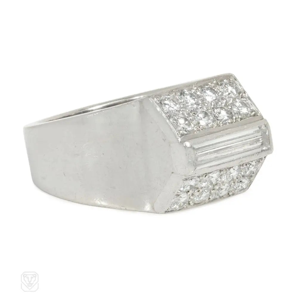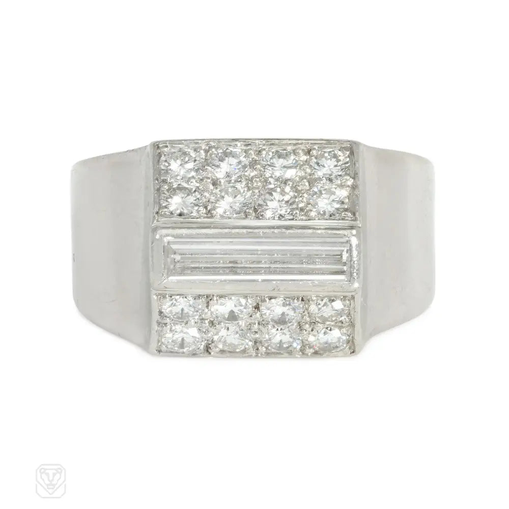 An Art Moderne ring of triangular wedge design, centering a horizontal baguette diamond flanked top-and-bottom by pavé diamond plaques, in platinum. Atw 1.5ct
