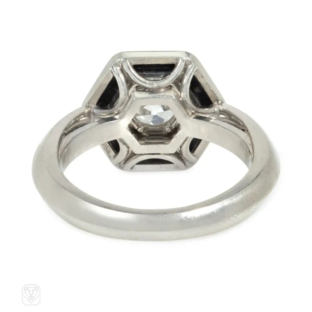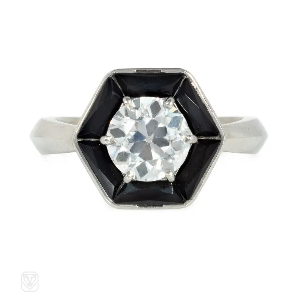 An Art Deco diamond solitaire ring in a hexagonal french-cut onyx surround, in platinum. Atw 1.50cts
