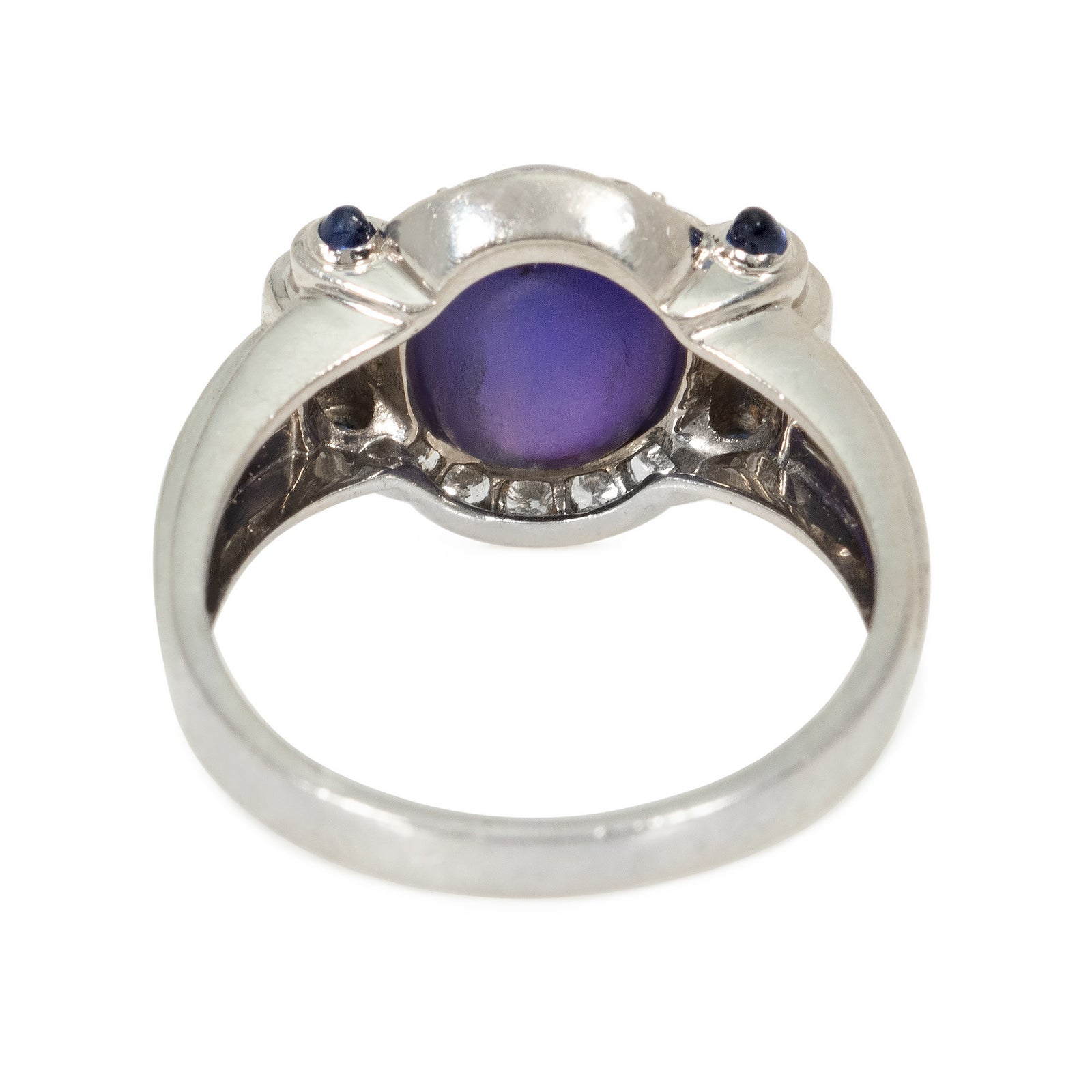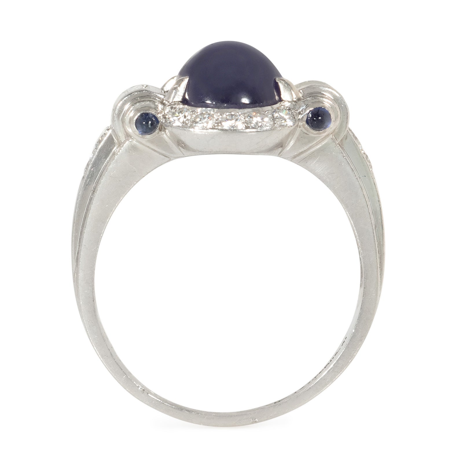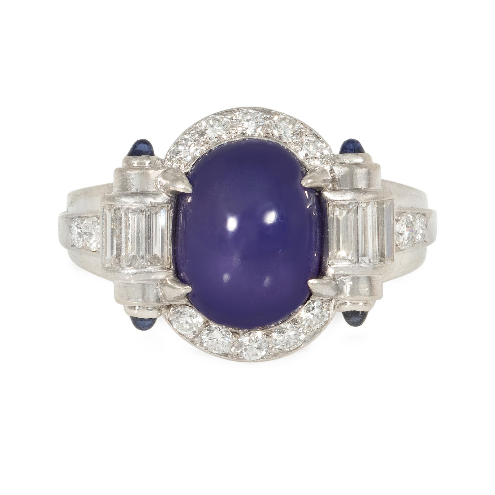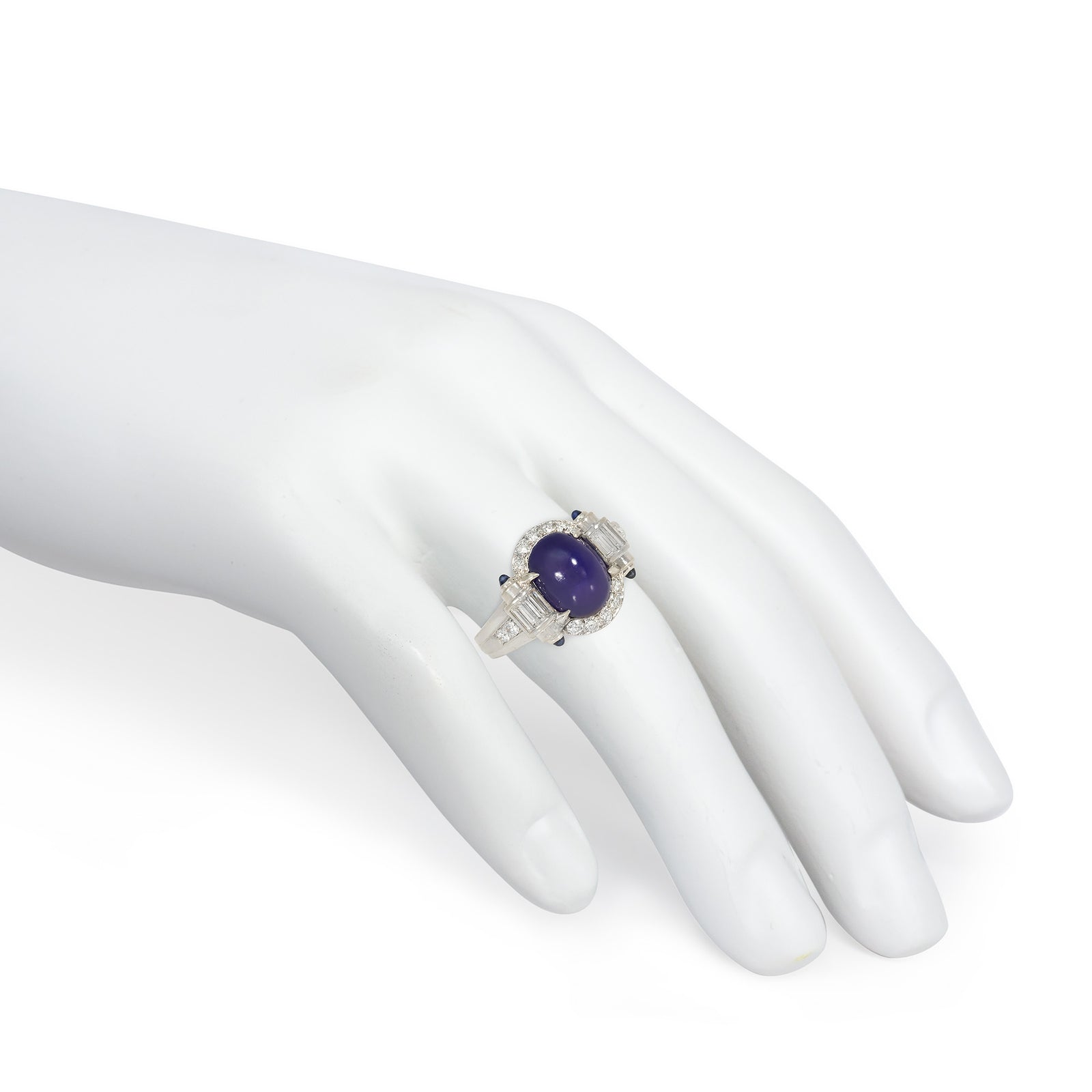 An Art Deco sapphire and diamond cluster ring, centered by a purple star sapphire with a diamond surround, the shoulders set with baguette diamonds terminating top-and-bottom with cabochon blue sapphires, in platinum.