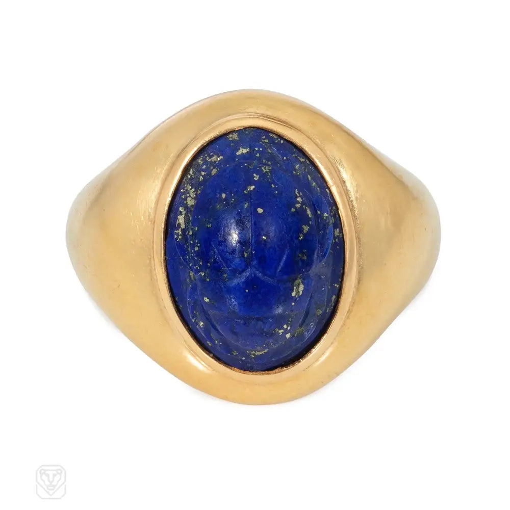 A lapis and gold ring, centered by an oval, bezel-set, carved lapis scarab, in 18k. Cartier. #05551.