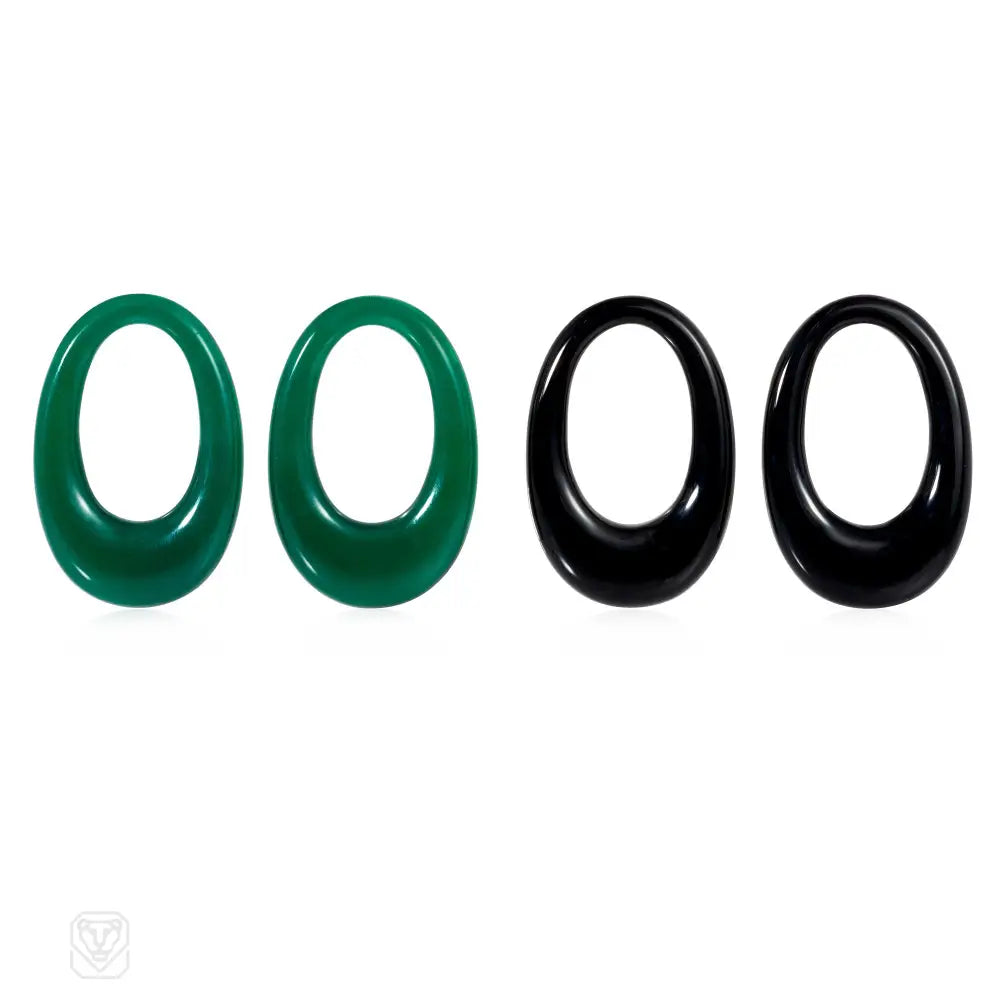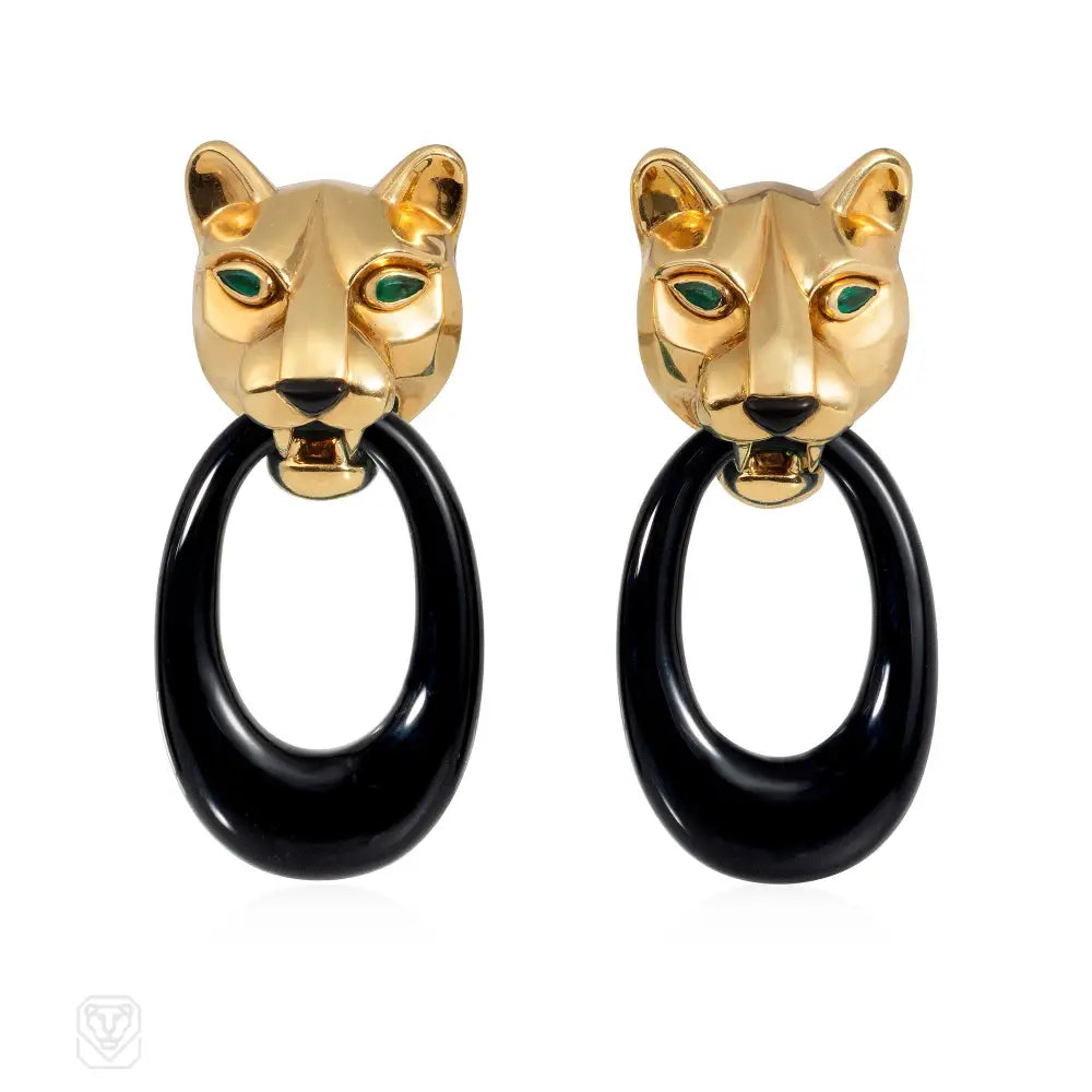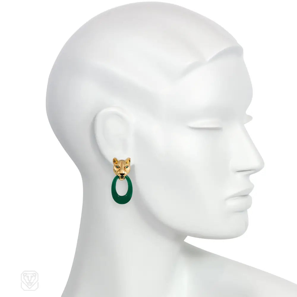 A pair of day-to-night gold and onyx "Panthere" doorknocker earrings, with interchangable onyx and chrysoprase hoops, in 18k. Cartier, France.