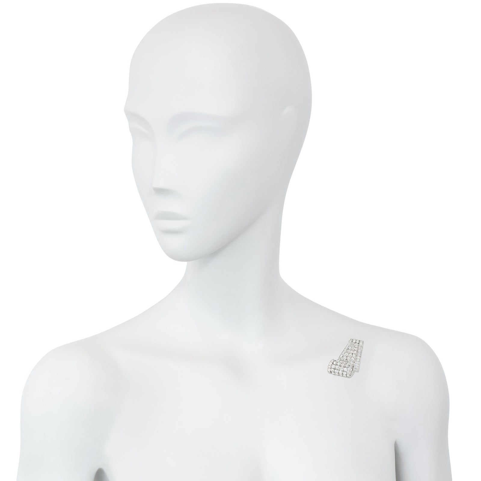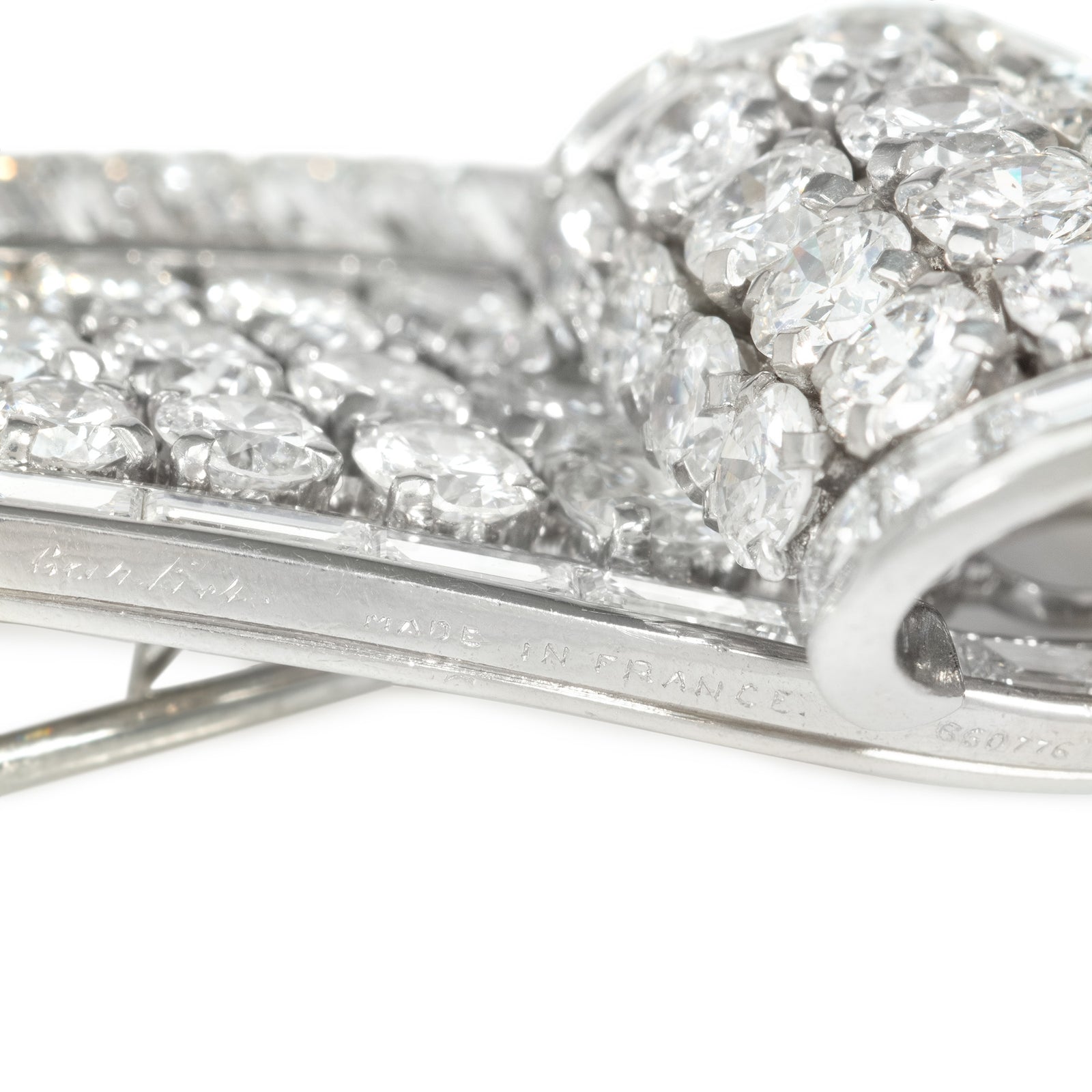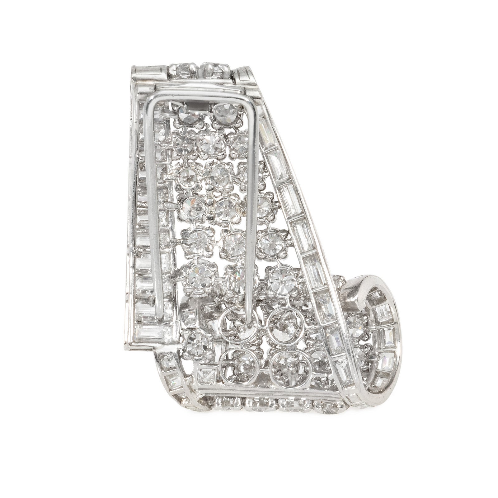 A Mid-Century diamond dress clip of tapering scroll design, centered by round-brilliant-cut diamonds, flanked by horizontally and vertically set baguette-cut diamonds, in platinum. Cartier, France. #860775. Atw diamonds 10.50 cts.