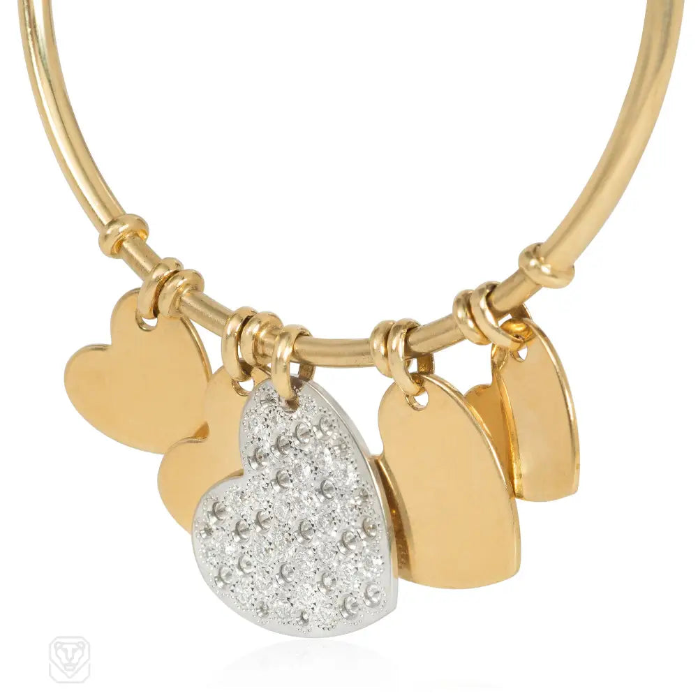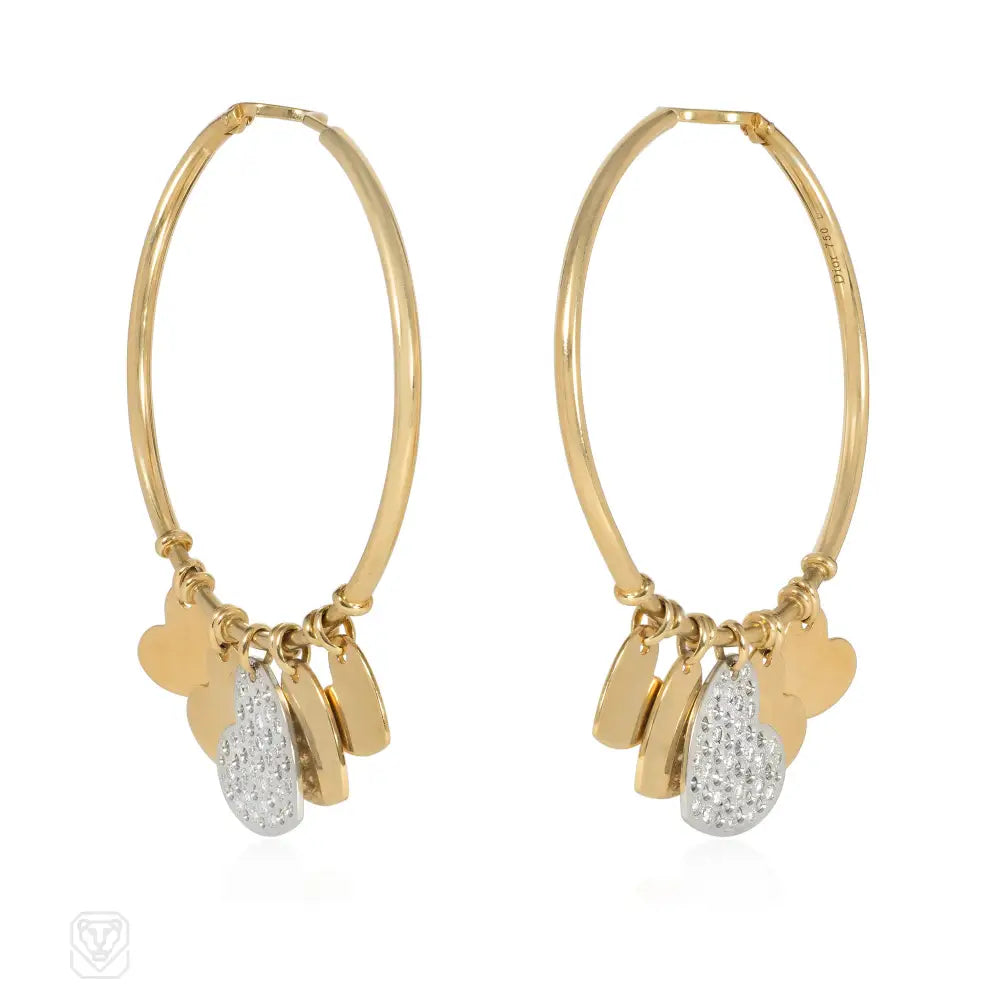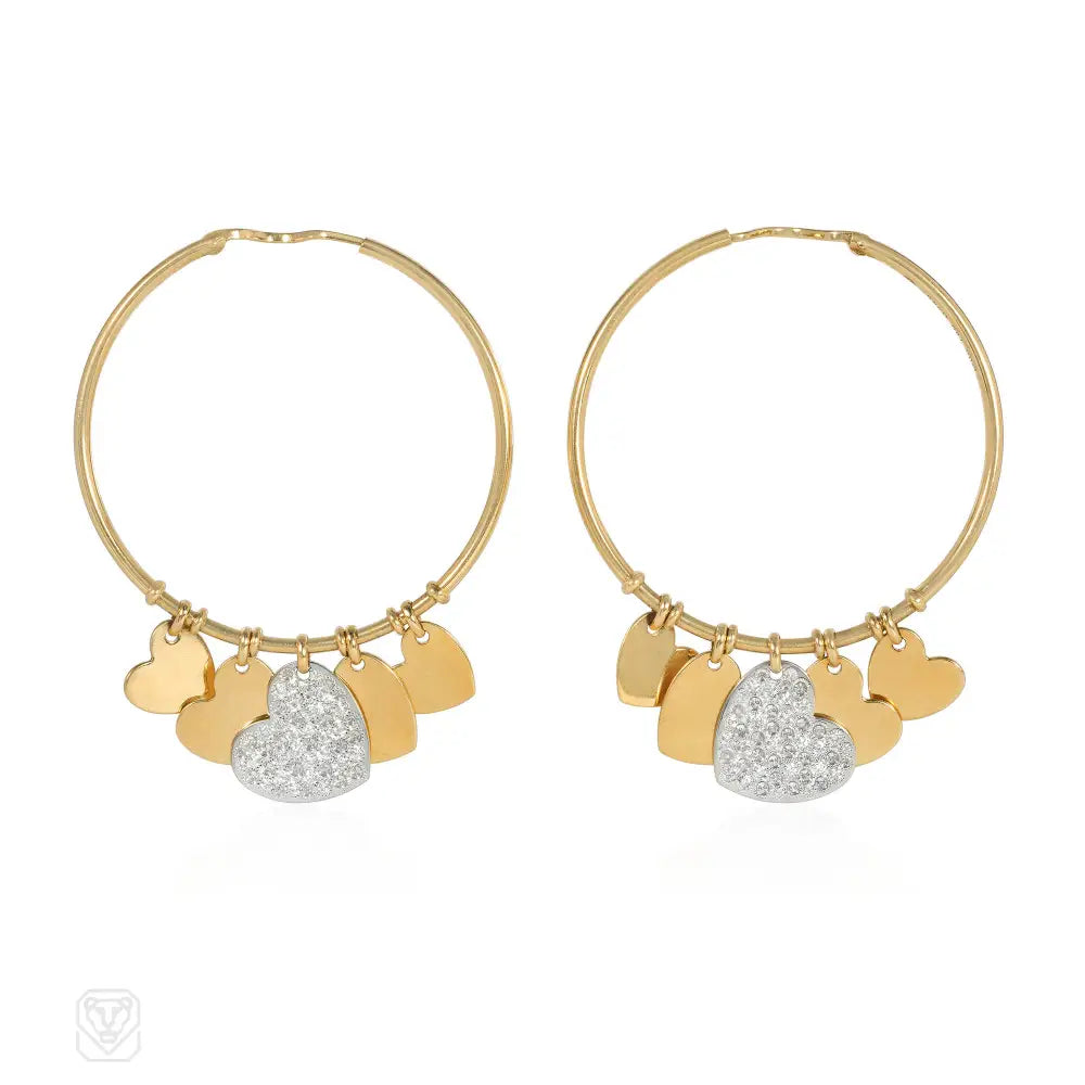 A pair of gold hoop earrings with four gold heart pendants and a central pavé diamond heart, in 18k. Dior, Paris. #D5457. Atw 0.80 ct.