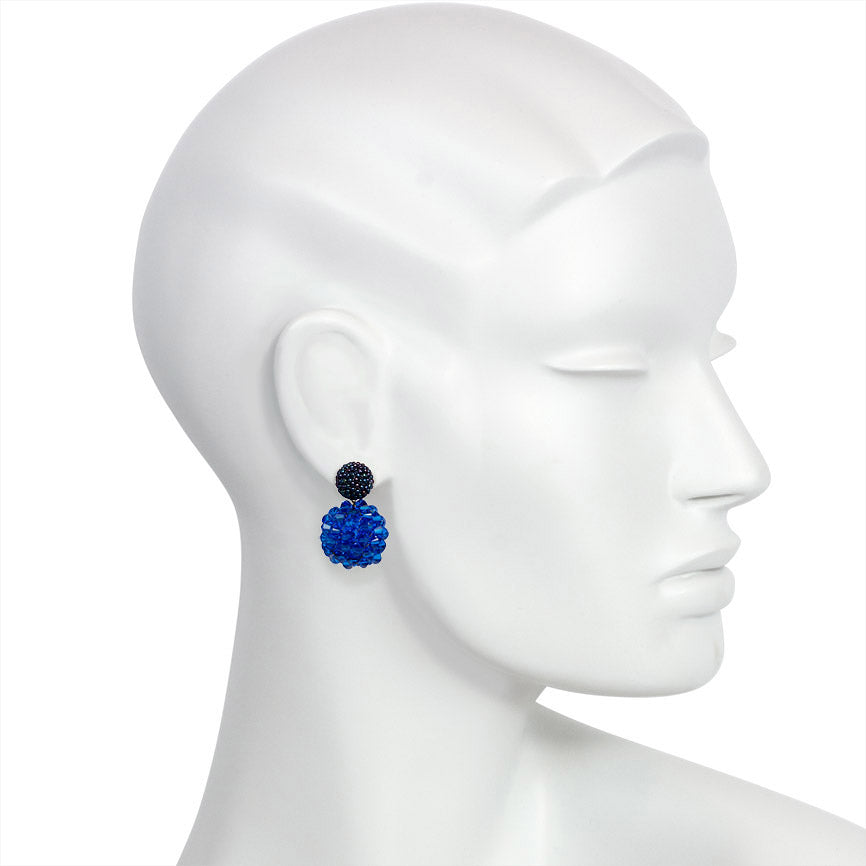 A pair of glass and crystal earrings with blackberry blue tops and teal blue bottoms, in 14k gold. Axel Russmeyer