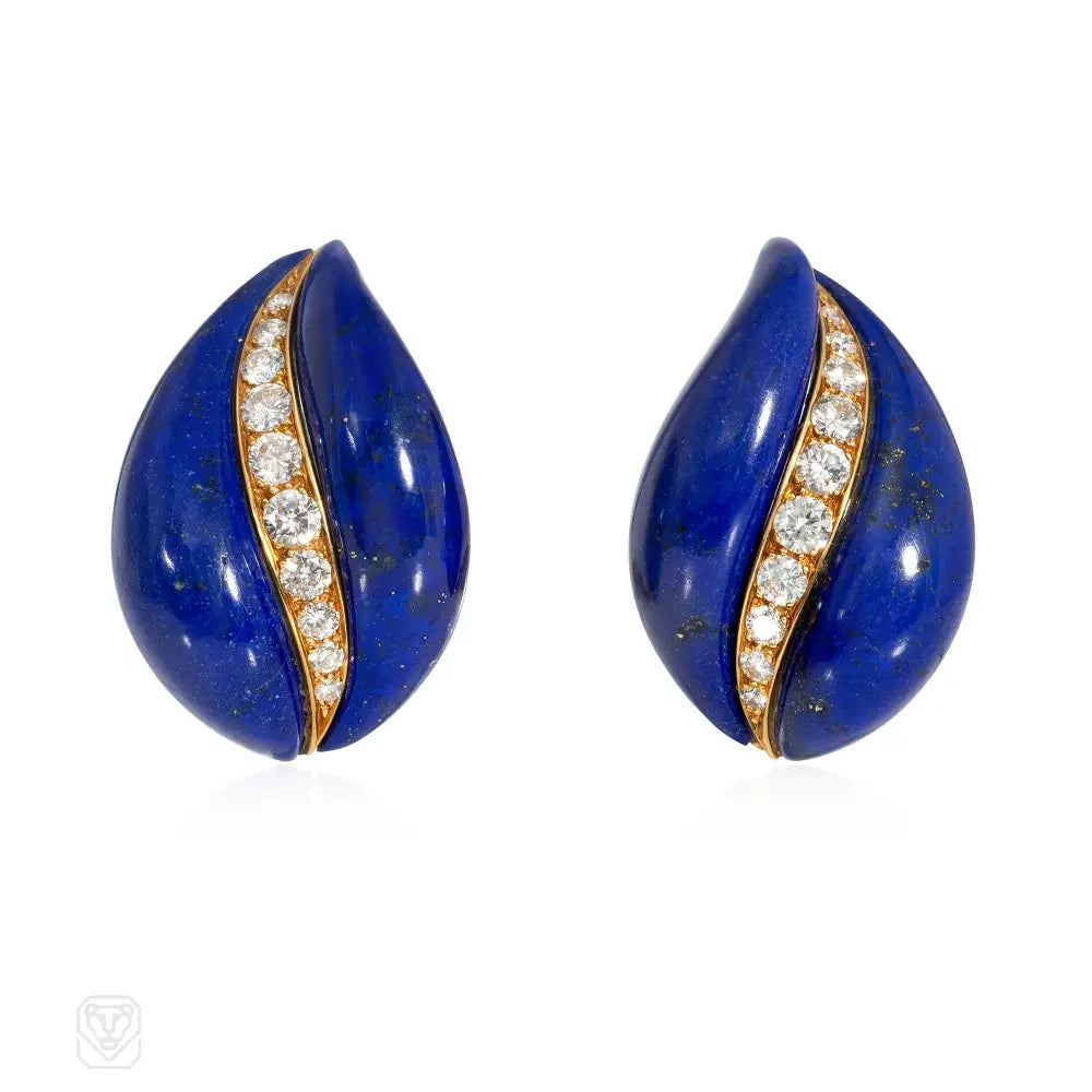 A pair of carved lapis, diamond, and gold earrings of stylized leaf design, in 18k Georland, France.
