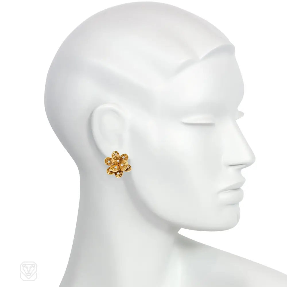 A pair of Mid-Century gold earrings designed as clustered overlapping oval disks set with a central diamond, in 18k. France. Atw diamonds .54 ct. Maker's poinçon for Richards.