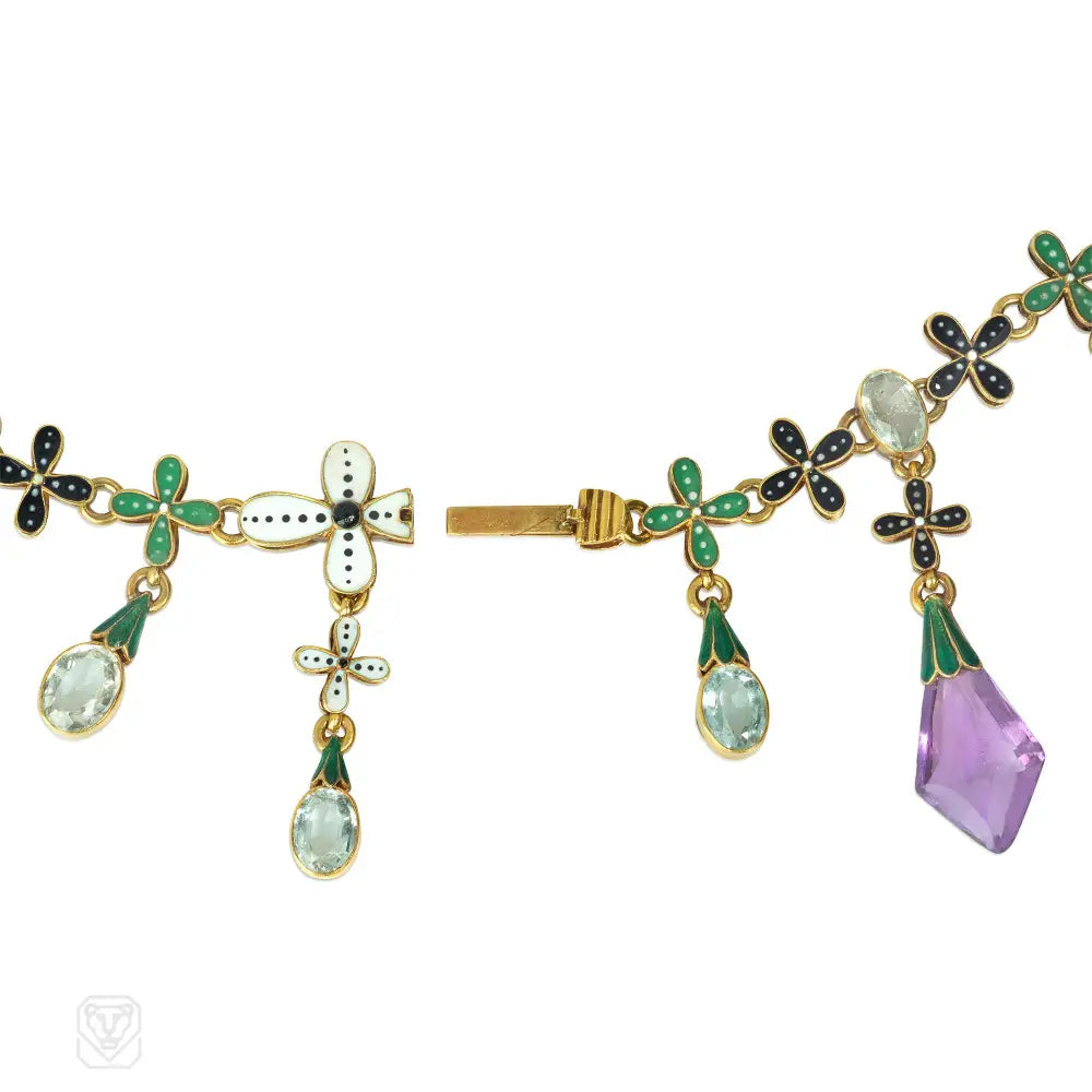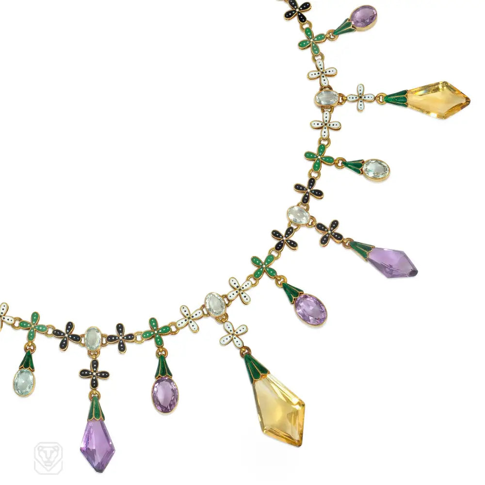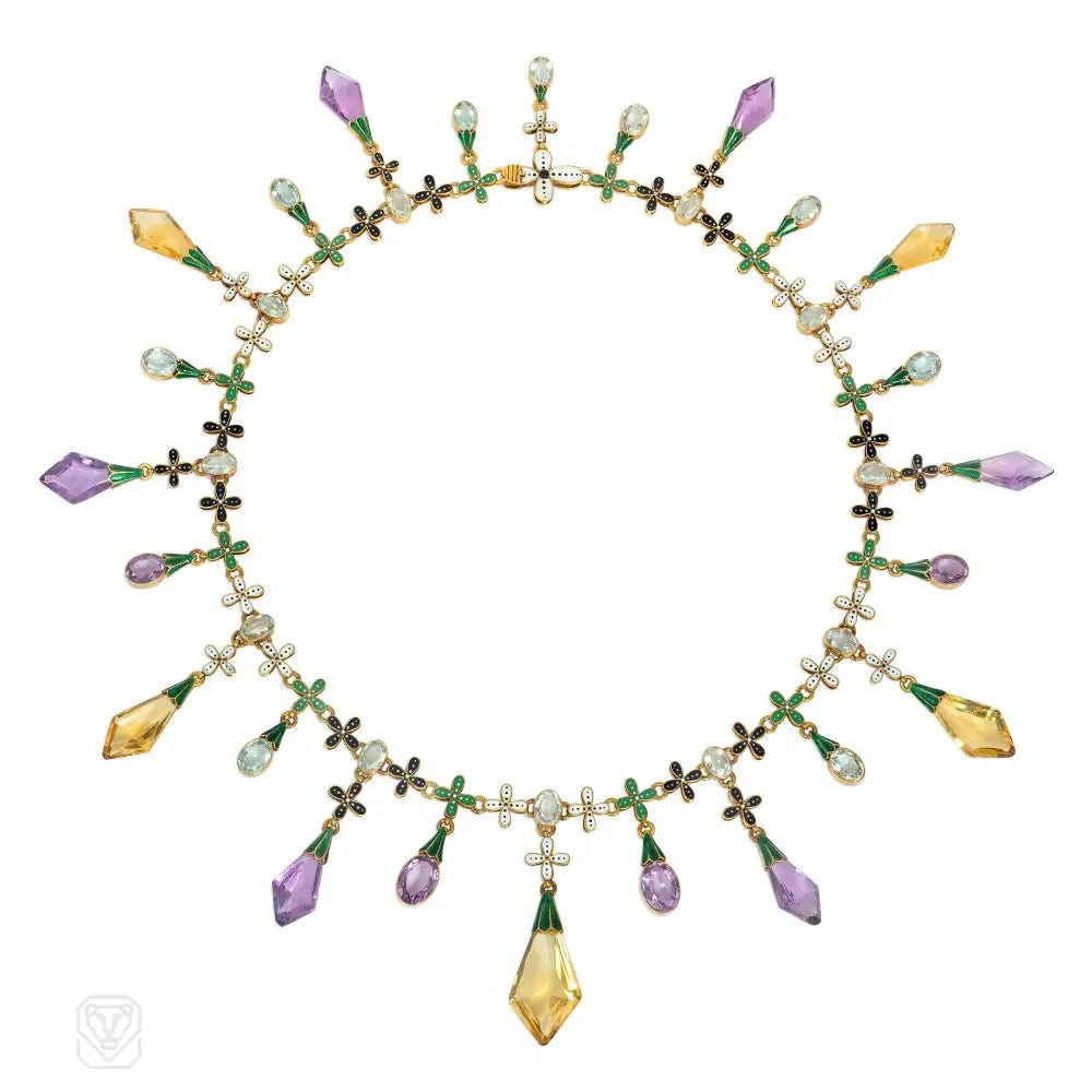 A Victorian gold, polychrome enamel, and multi-gem necklace comprised of white, green, and black enamel florets suspending kite-shaped amethyst and citrine drops alternating with collet-set pendant amethysts and aquamarines, in 18k. Signed 'C.G.' for Carlo Giuliano.
