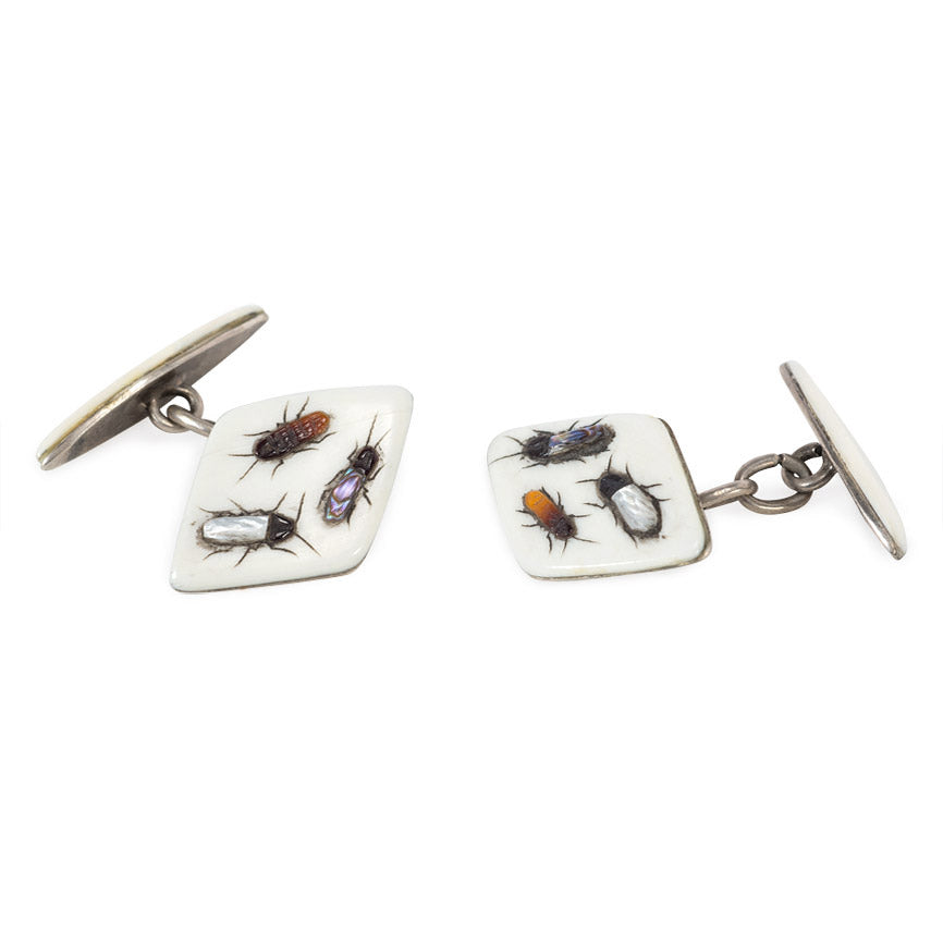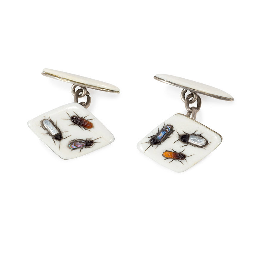 A pair of antique shibayama cufflinks with insect motifs, in sterling silver. Japan