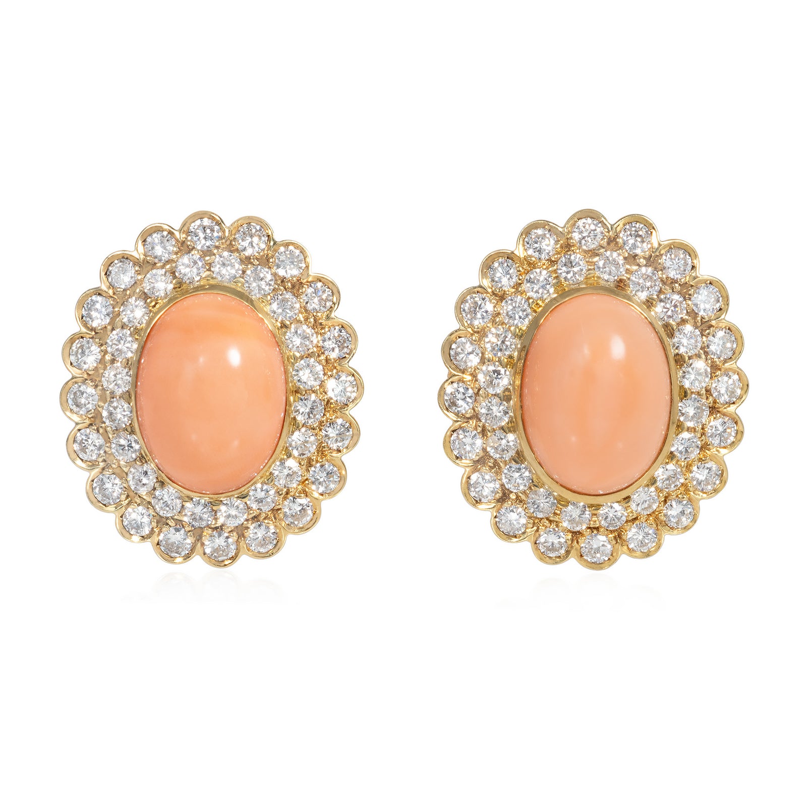 A pair of Retro angel skin coral and diamond oval cluster earrings, centered by cabochon coral set in a two-tiered diamond surround with a scalloped border, with clip backs, in 14k. Marked Pat. 2432904 for George Schuler.