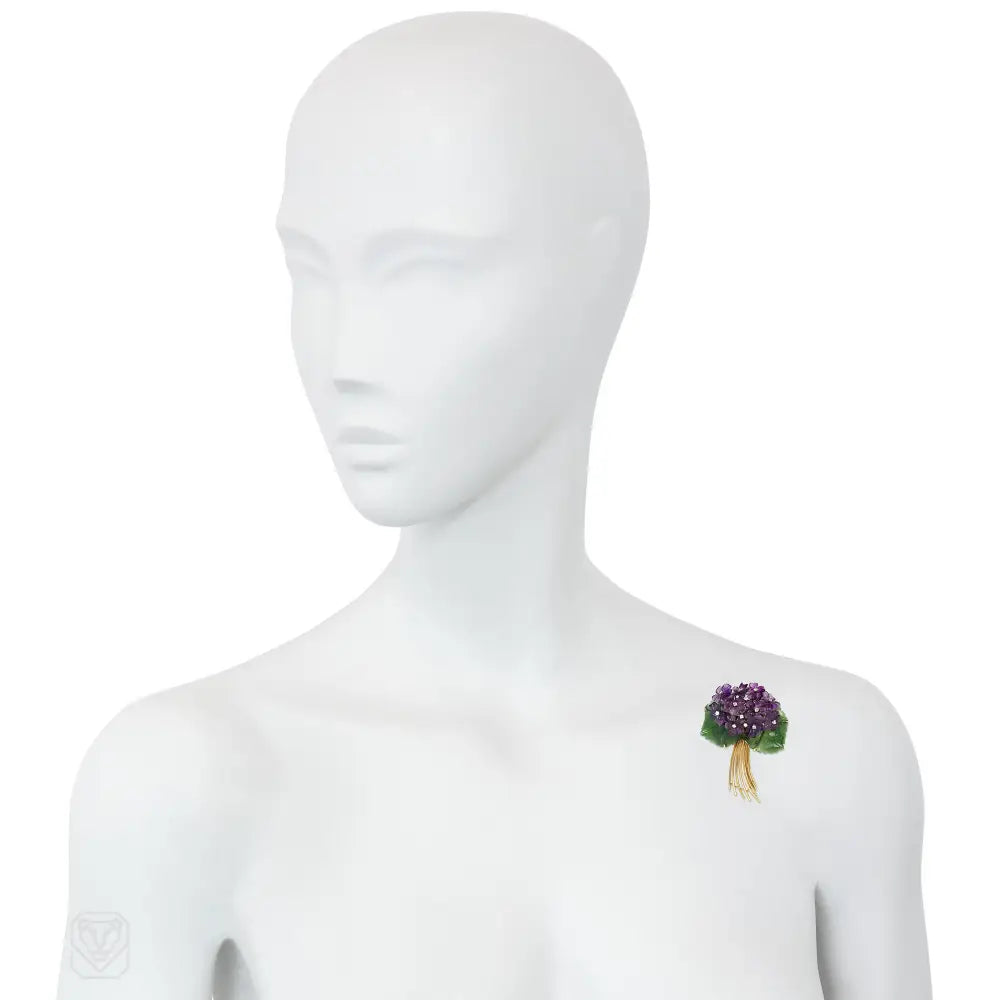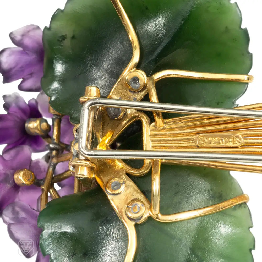 A Retro carved amethyst and nephrite brooch designed as bouquet of violets with diamond centers, in 18k. Austria