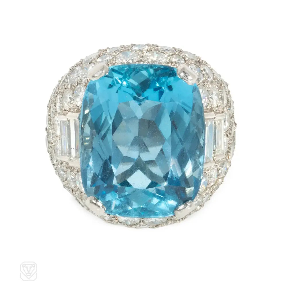 A Retro diamond and cushion-cut aquamarine, Trombino-style cocktail ring, in platinum. French Import marks. Aqua atw 16ct, Dia atw 4.75ct