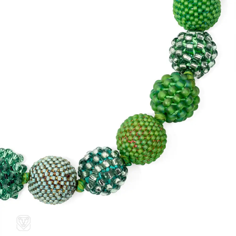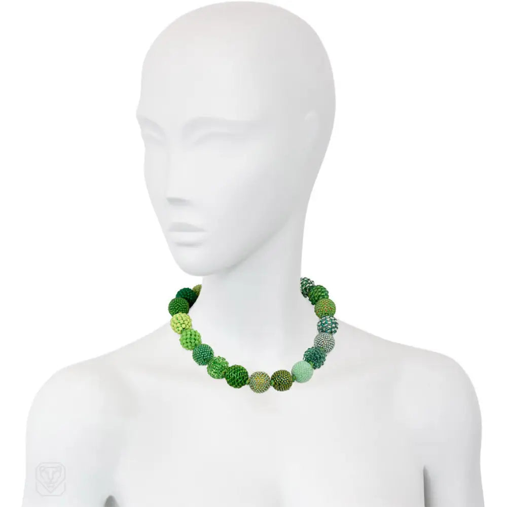A ball necklace with bright green glass and crystal beads and 18k gold bayonet closure. Axel Russmeyer.