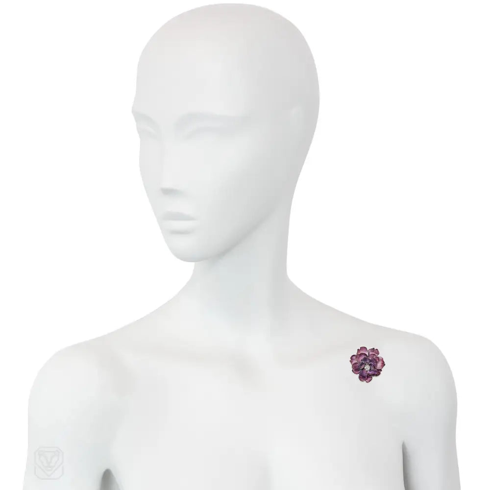 An Art Nouveau purple enamel brooch in the form of a Russian violet with a diamond dew drop, Tiffany & Co.