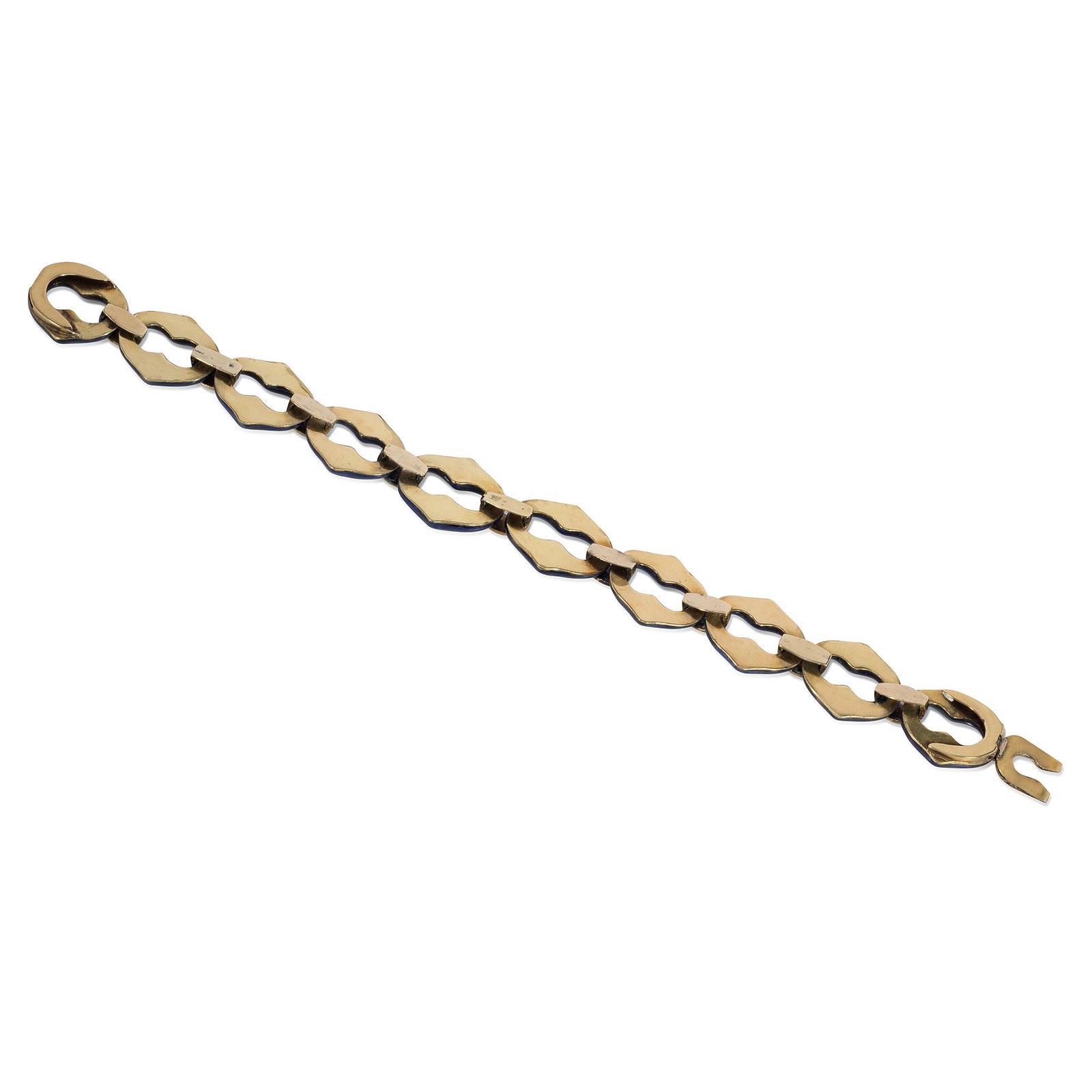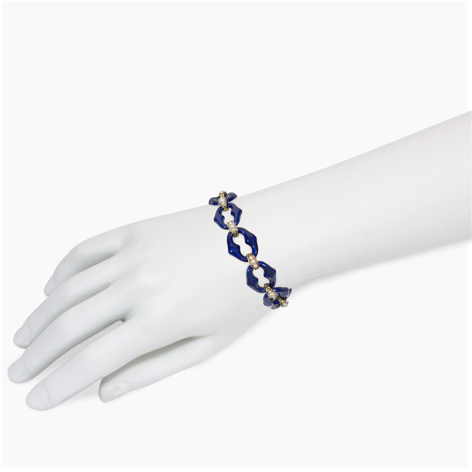 An antique bracelet comprised of blue enamel links with half-pearl spacers, in 15k gold; with fitted antique case. England
